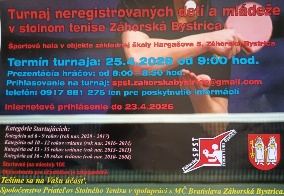 Prihlásením na turnaje dávam súhlas na spracovanie poskytnutých údajov pre evidenciu na športovom podujatí podľa § 6 až 12 zákona č. 18/2018 Z. z. o ochrane osobných údajov a o zmene a doplnení niektorých zákonov, v súlade s nariadením Európskeho parlamentu a Rady (EÚ) 2016/679 z 27. apríla 2016 o ochrane fyzických osôb pri spracúvaní osobných údajov a o voľnom pohybe takýchto údajov. Vyhlasujem, že som fyzicky spôsobilý/á/ absolvovať stolnotenisový turnaj a zúčastňujem sa ich na vlastné nebezpečie a vlastnú zodpovednosť. Beriem na vedomie, že organizátor nezodpovedá za stratu osobných veci. Účastník turnaja je povinný zabezpečiť si individuálne zdravotné poistenie