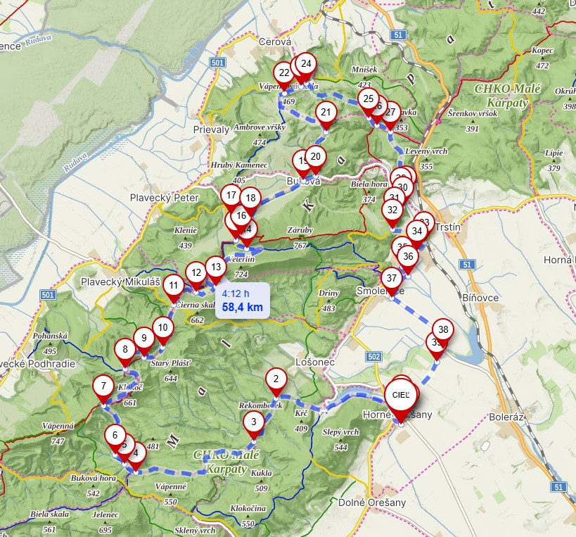 TRASA - 58,4 km - vedie krásnou trasou po hrebeňoch Malých Karpát. Dĺžka trate bude upresnená vzhľadom na uzávierku cesty o obci Horné Orešany