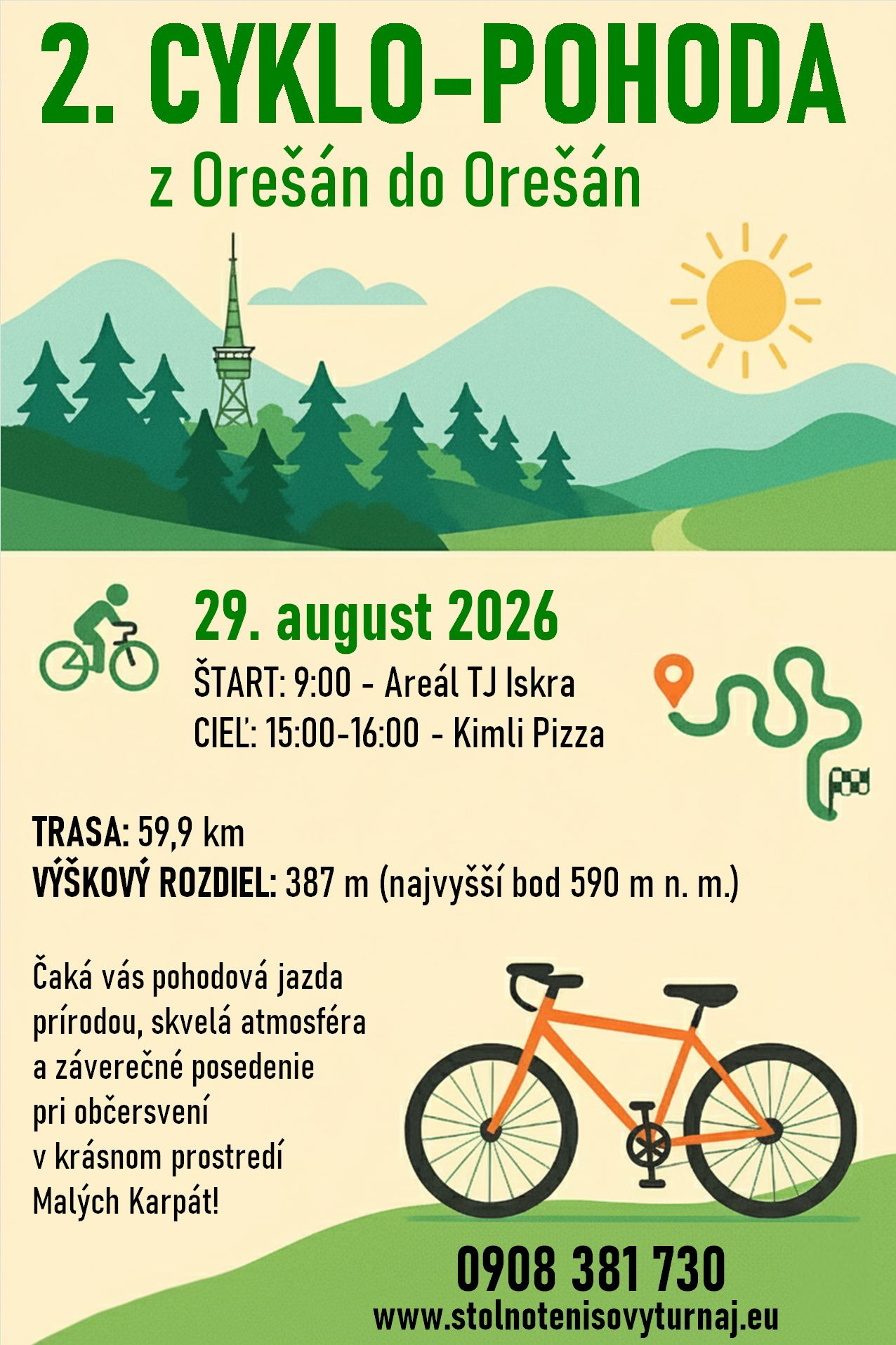 Naša trasa tentokrát štartuje a končí v Horných Orešanoch v areáli TJ Iskra (futbalové ihrisko). Z areálu TJ Iskra Horné Orešany sa vydáme na cestu prekrásnou, no zároveň náročnou malokarpatskou prírodou, ktorá vás očarí svojimi výhľadmi a výzvami. Cieľom našej cyklistickej púte sú Kimli Pizza (v areáli TJ Iskra), kde na nás bude čakať zaslúžená odmena – posedenie pri skvelom jedle a kvalitnom českom vychladenom pivečku.