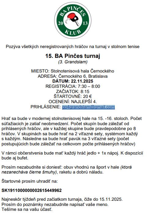 Štartové treba uhradiť prevodom vopred na bankový účet - SK1911000000002615449962 (do poznámky uveďte meno hráča)
