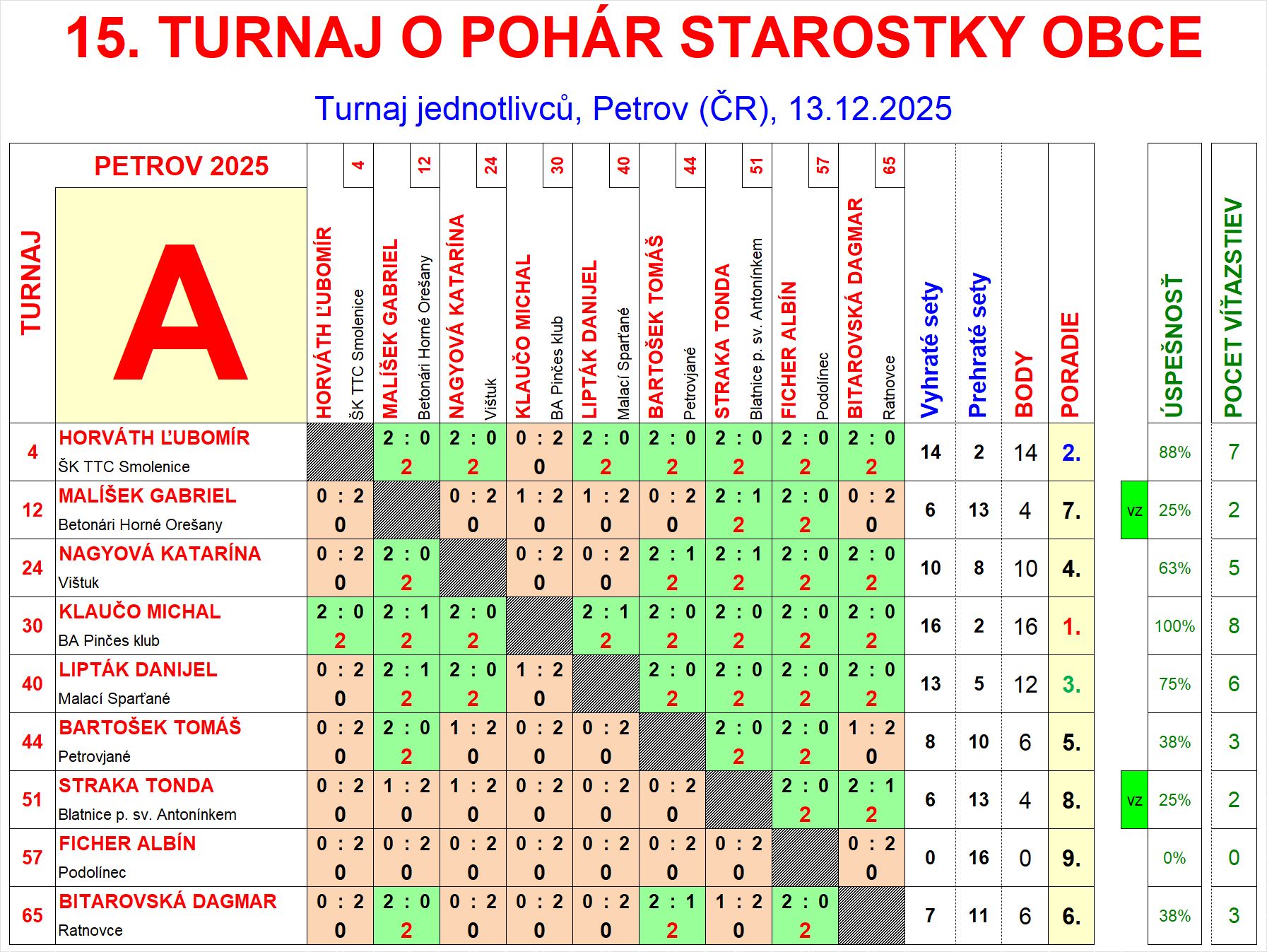 | A2 | 14 | 14 | 2 | Horváth Ľubomír | ŠK TTC Smolenice | SVK | |