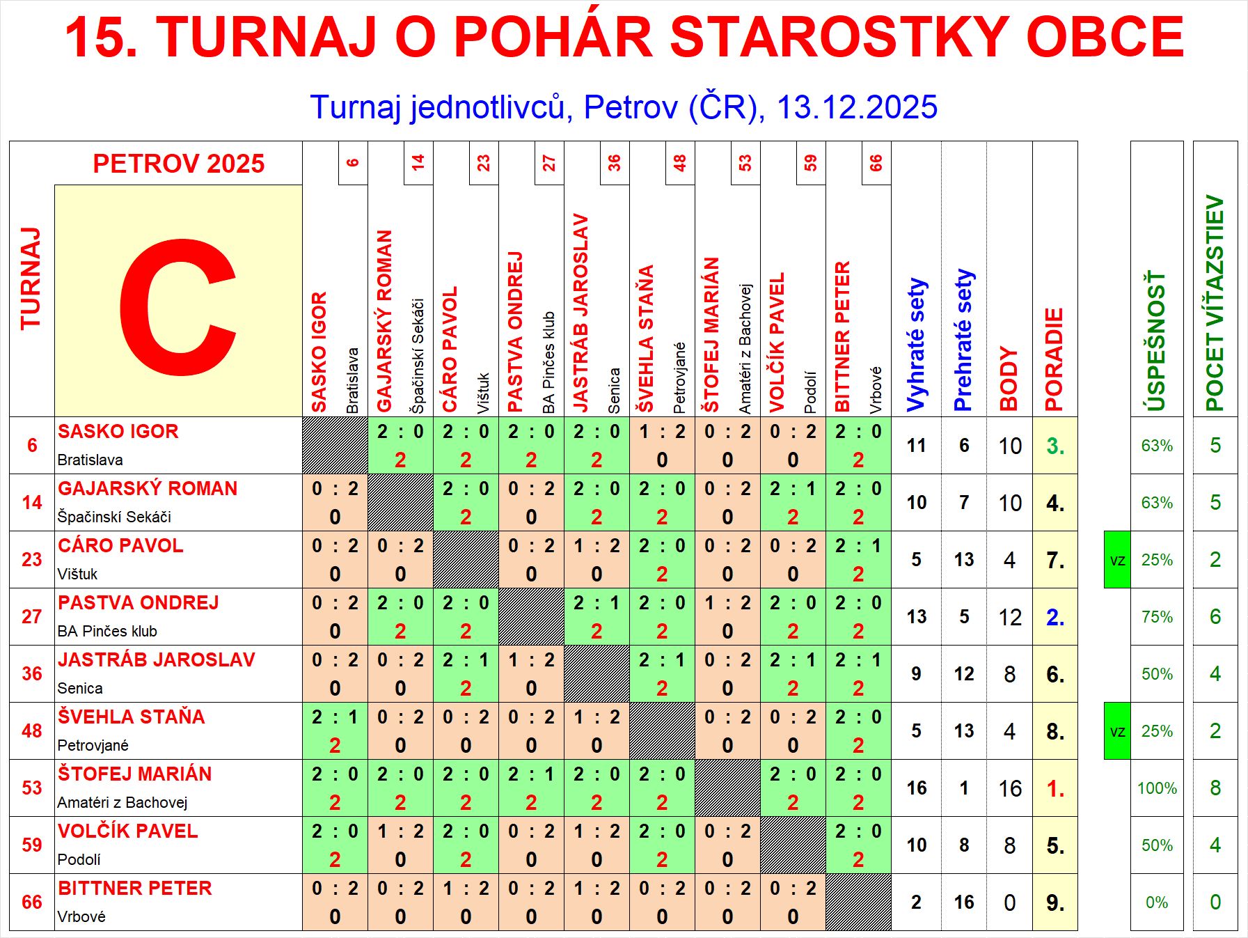 | C9 | 0 | 2 | 16 | Bittner Peter | Vrbové | SVK | |