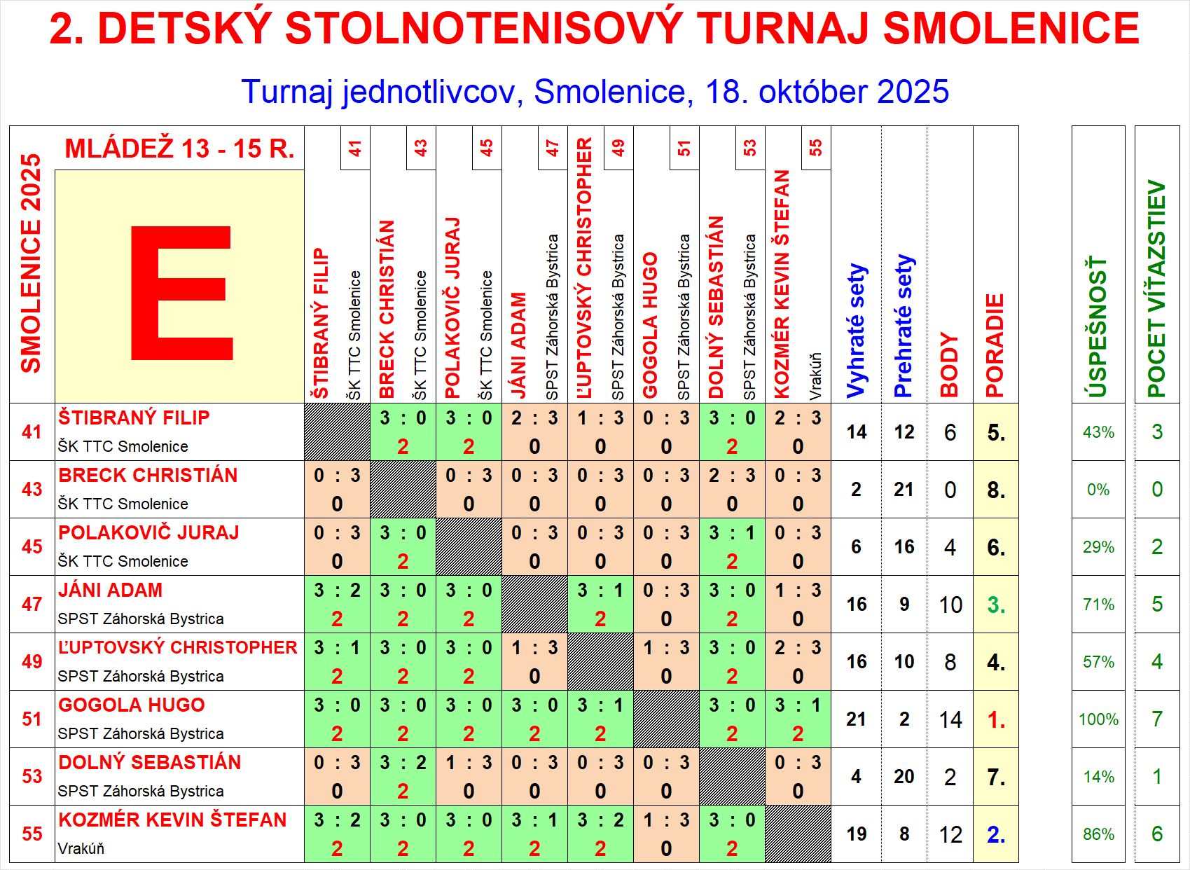 | 9.-15. miesto | E5 | 6 | 14 | 12 | Štibraný Filip | ŠK TTC Smolenice | SVK |