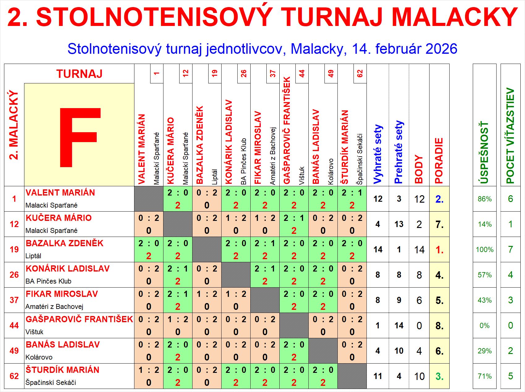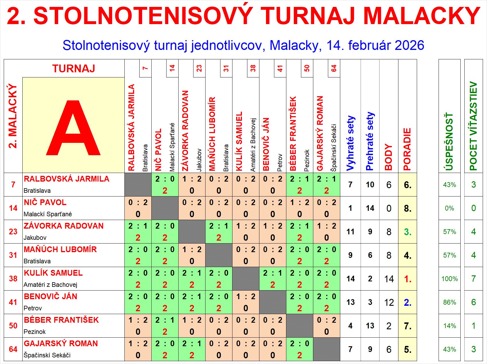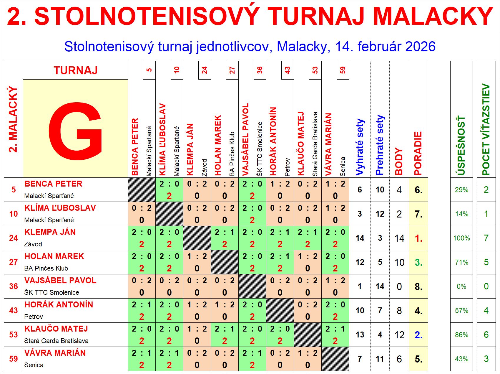 | G8 | 0 | 1 | 14 | Vajsábel Pavol | ŠK TTC Smolenice | SVK | |