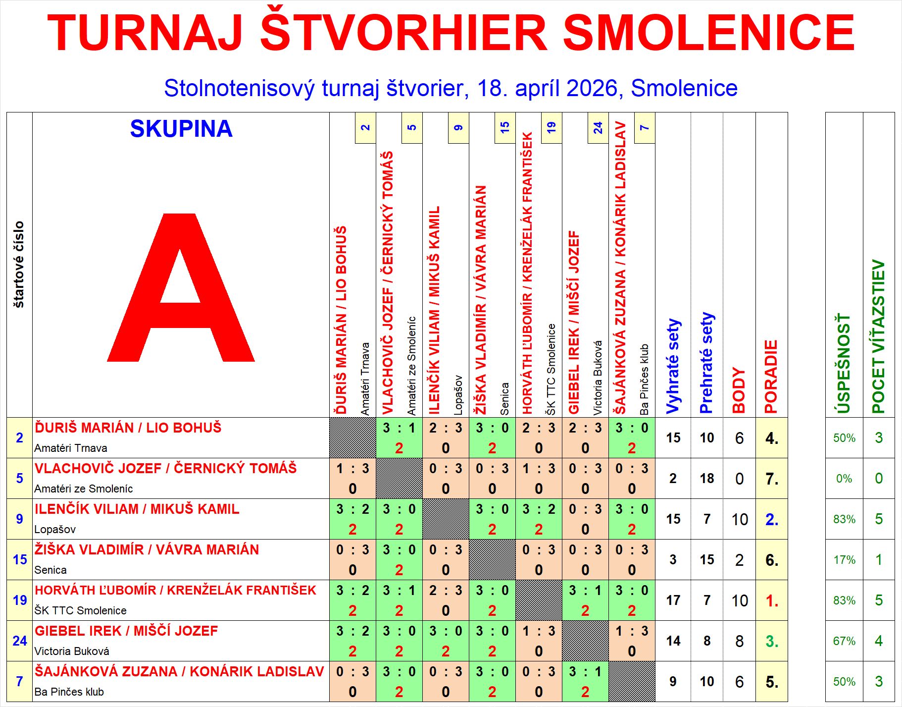 | A4 | 6 | 15 | 10 | 2 | Ďuriš Marián / Puchel Ivan | Amatéri Trnava | SVK | |