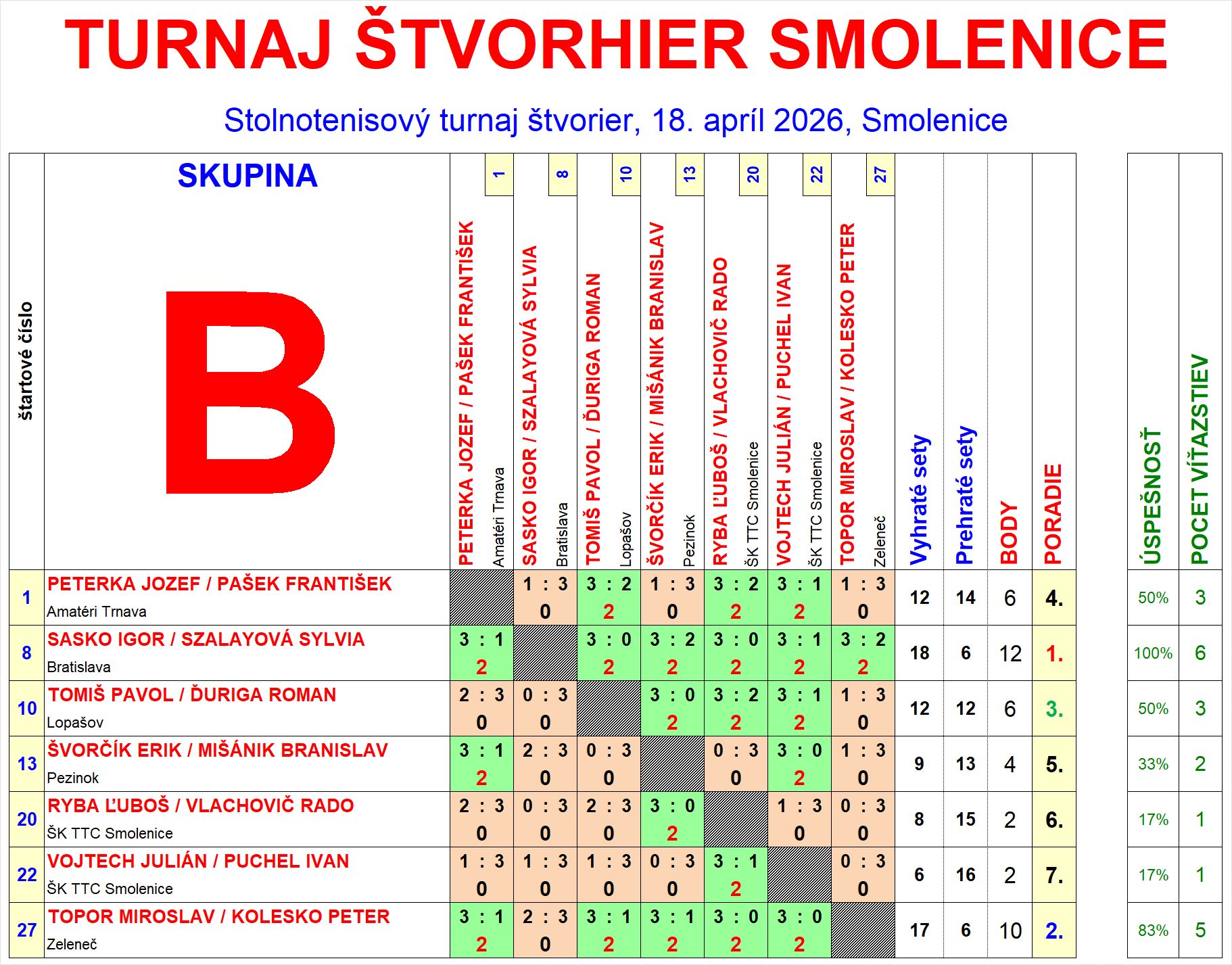 | B6 | 2 | 8 | 15 | 20 | Ryba Ľuboš / Vlachovič Rado | ŠK TTC Smolenice | SVK | |
