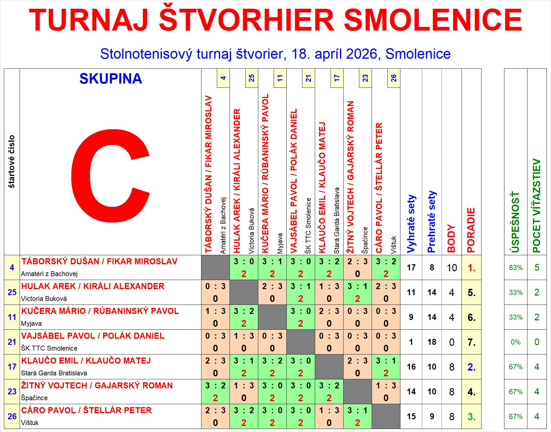| C7 | 0 | 1 | 18 | 21 | Vajsábel Pavol / Polák Daniel | ŠK TTC Smolenice | SVK | |