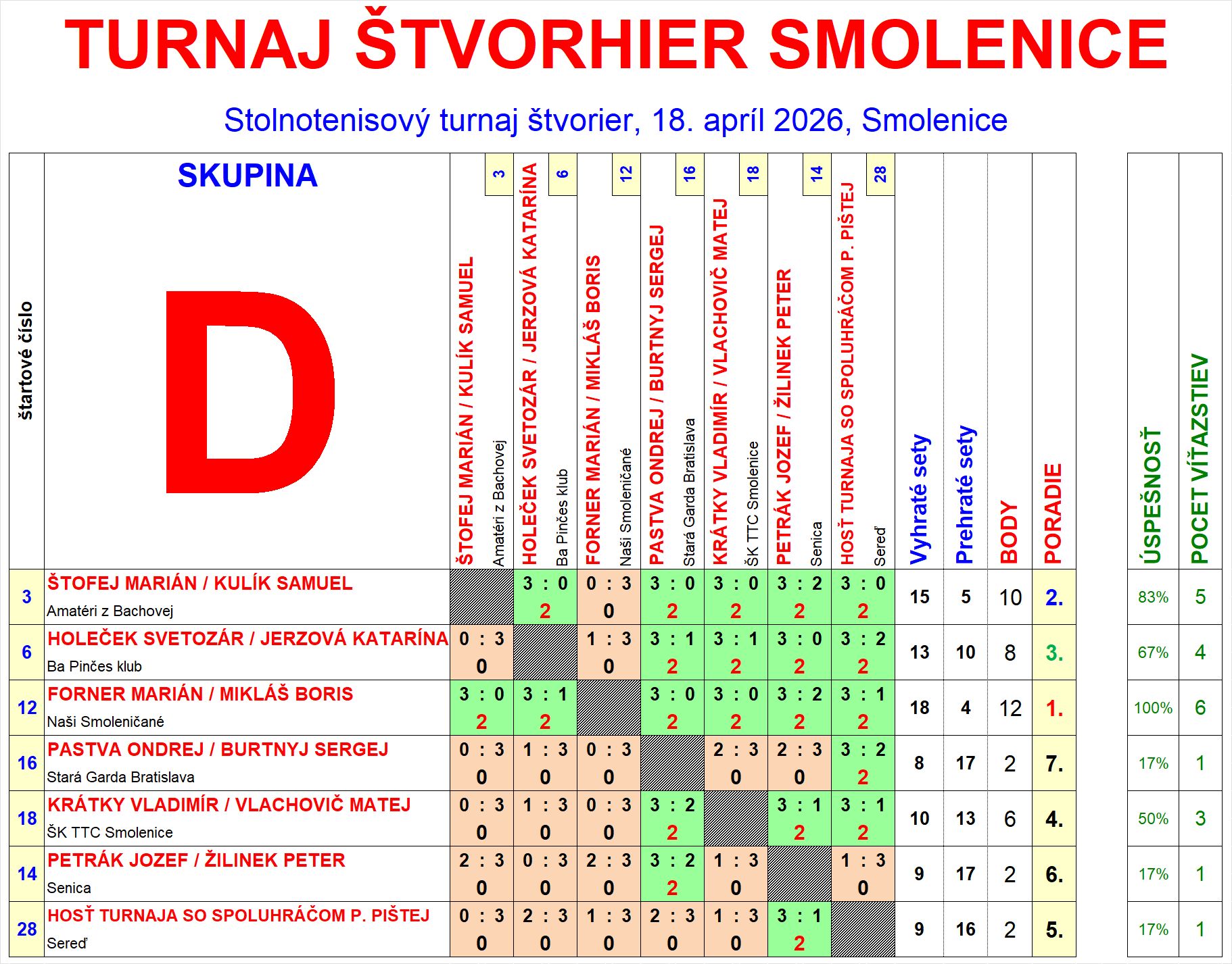 | D4 | 6 | 10 | 13 | 18 | Krátky Vladimír / Vlachovič Matej | ŠK TTC Smolenice | SVK | |